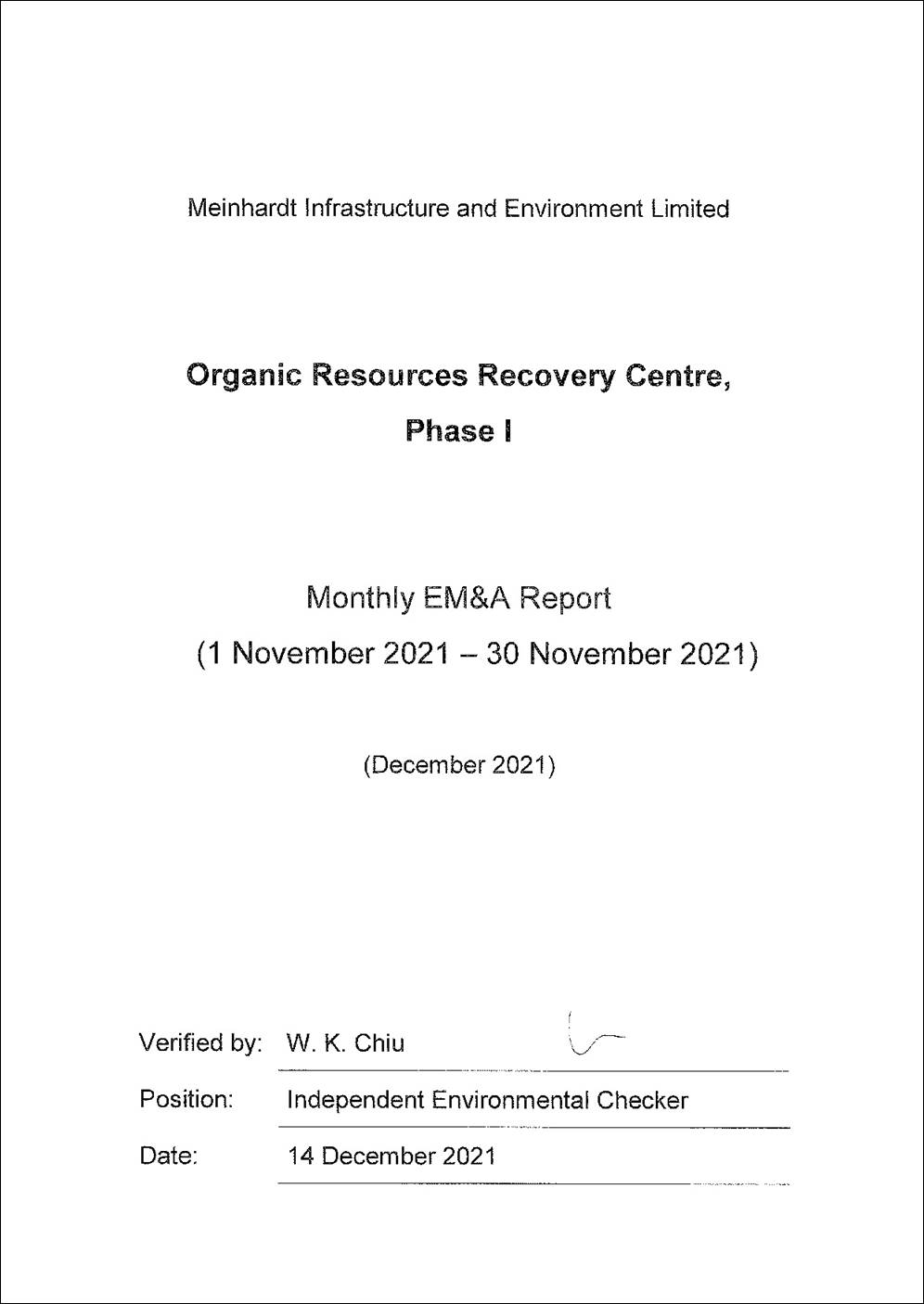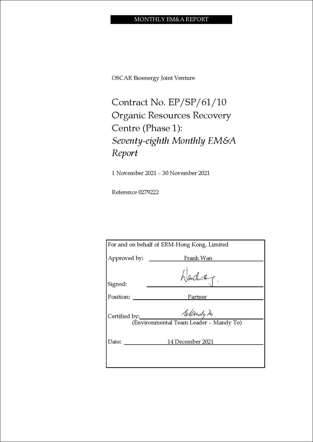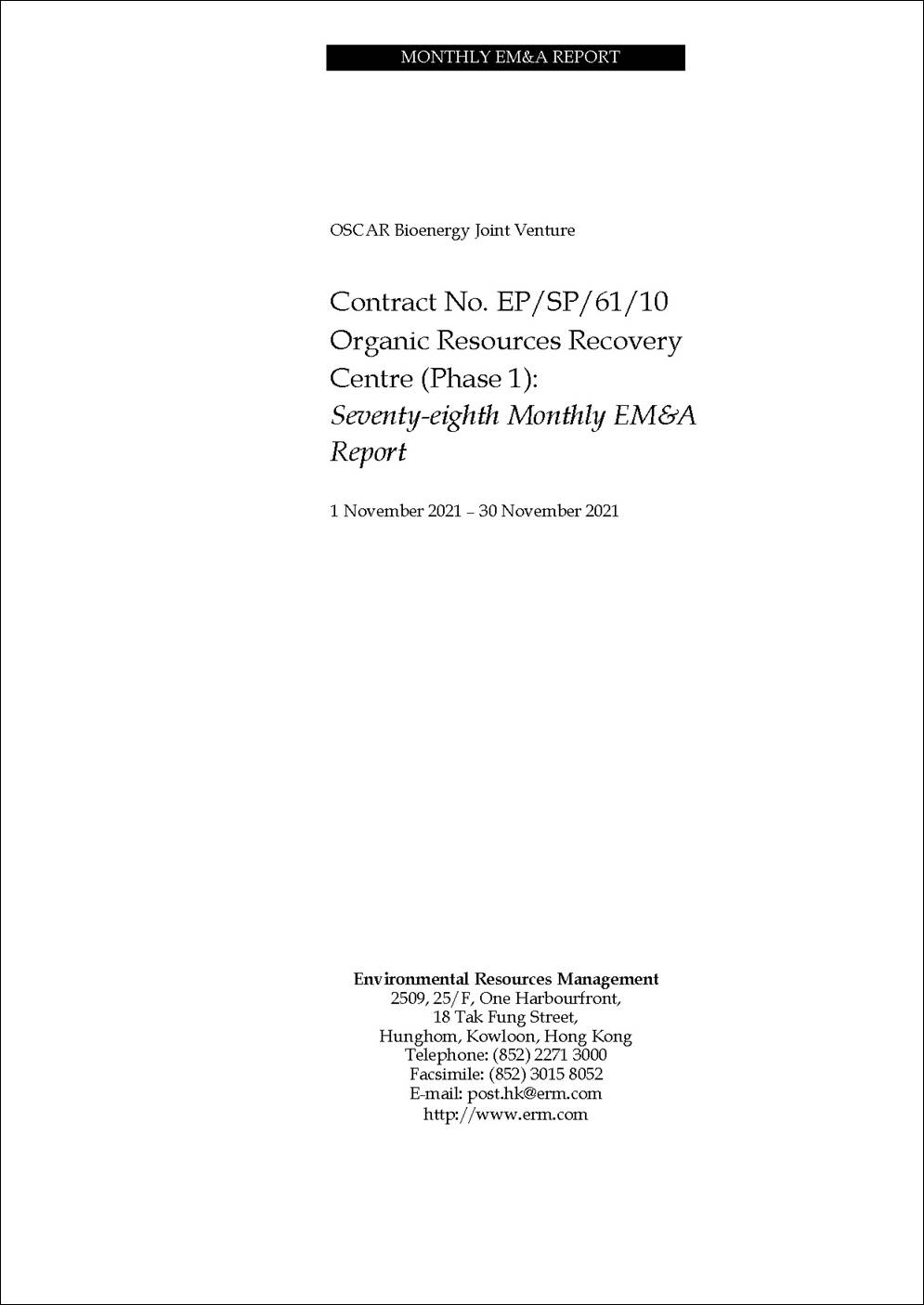 The construction works of No. EP/SP/61/10 Organic Resources Recovery Centre Phase 1 (the Project) commenced on 21 May 2015. This is the 78th monthly Environmental Monitoring and Audit (EM&A) report presenting the EM&A works carried out during the period from 1 to 30 November 2021 in accordance with the EM&A Manual. Substantial completion of the construction works was confirmed on 3 December 2018. In the meantime, the operation phase EM&A programme had commenced in March 2019. Substantial Completion in respect of substantial part of the Works was confirmed on 24 February 2020. The construction phase EM&A programme was completed in the end of February 2020.
