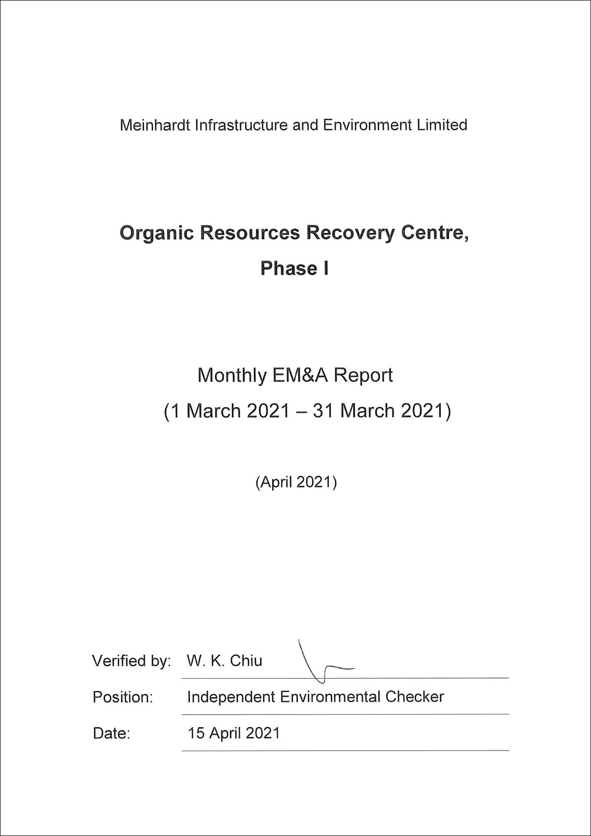 The construction works of No. EP/SP/61/10 Organic Resources Recovery Centre Phase 1 (the Project) commenced on 21 May 2015. This is the 70th monthly Environmental Monitoring and Audit (EM&A) report presenting the EM&A works carried out during the period from 1 to 31 March 2021 in accordance with the EM&A Manual. Substantial completion of the construction works was confirmed on 3 December 2018. In the meantime, the operation phase EM&A programme had commenced in March 2019. Substantial Completion in respect of substantial part of the Works was confirmed on 24 February 2020. The construction phase EM&A programme was completed in the end of February 2020.