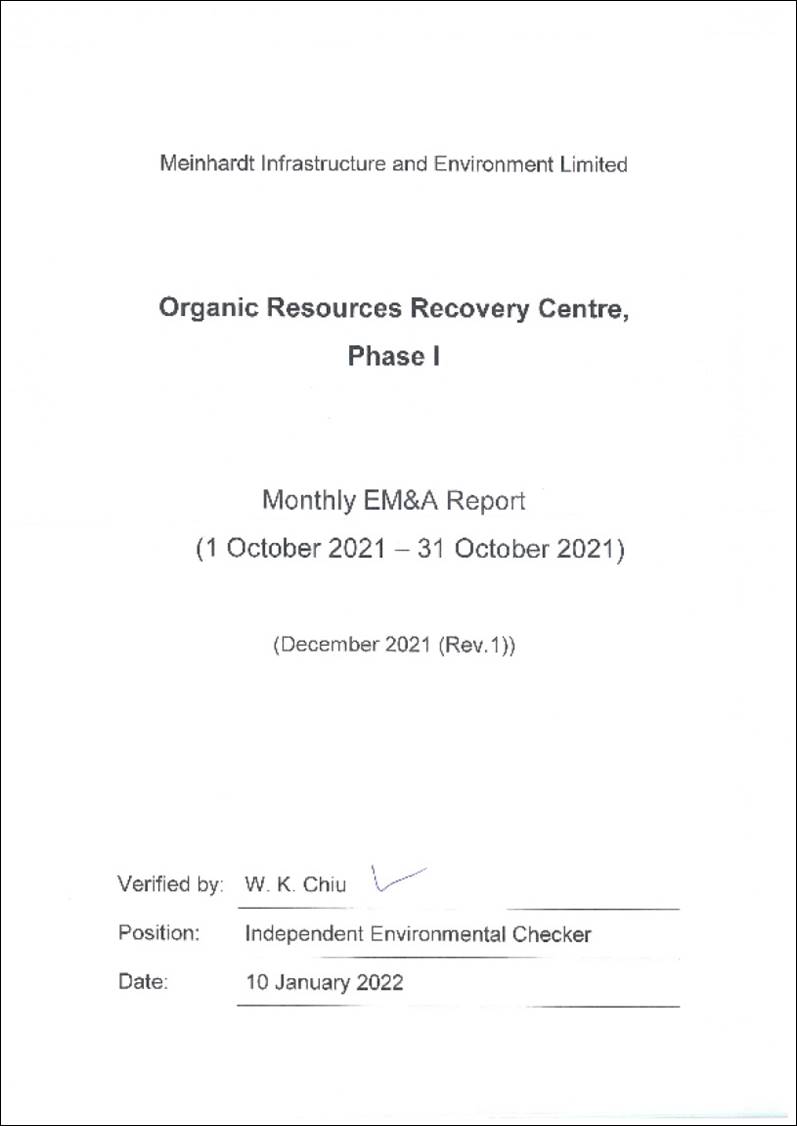 The construction works of No. EP/SP/61/10 Organic Resources Recovery Centre Phase 1 (the Project) commenced on 21 May 2015. This is the 77th monthly Environmental Monitoring and Audit (EM&A) report presenting the EM&A works carried out during the period from 1 to 31 October 2021 in accordance with the EM&A Manual. Substantial completion of the construction works was confirmed on 3 December 2018. In the meantime, the operation phase EM&A programme had commenced in March 2019. Substantial Completion in respect of substantial part of the Works was confirmed on 24 February 2020. The construction phase EM&A programme was completed in the end of February 2020.