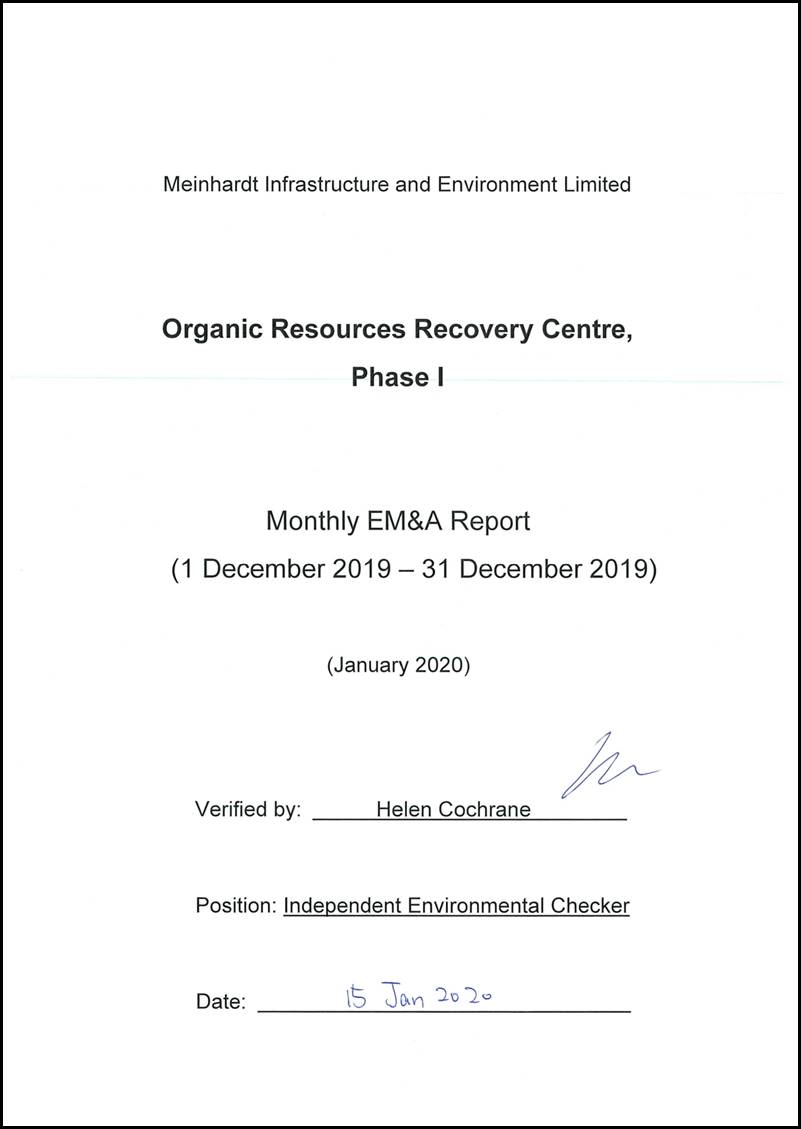 The construction works of No. EP/SP/61/10 Organic Resources Recovery Centre Phase 1 (the Project) commenced on 21 May 2015. This is the 55th monthly Environmental Monitoring and Audit (EM&A) report presenting the EM&A works carried out during the period from 1 to 31 December 2019 in accordance with the EM&A Manual. Substantial completion of the construction works was confirmed on 3 December 2018. In the meantime, the operation phase EM&A programme had commenced in March 2019.
