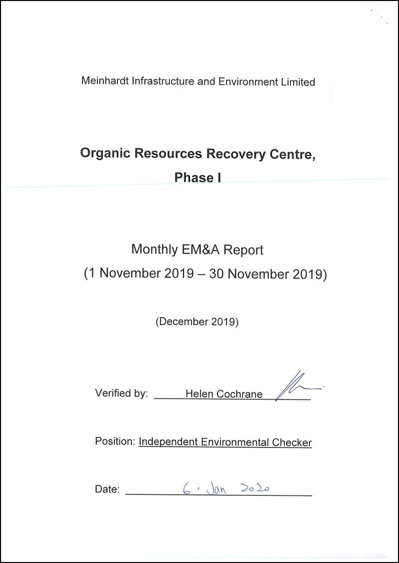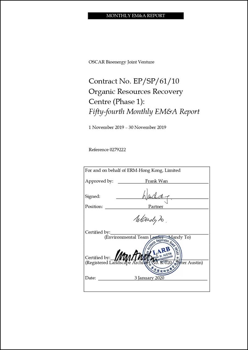 The construction works of No. EP/SP/61/10 Organic Resources Recovery Centre Phase 1 (the Project) commenced on 21 May 2015. This is the 54th monthly Environmental Monitoring and Audit (EM&A) report presenting the EM&A works carried out during the period from 1 to 30 November 2019 in accordance with the EM&A Manual. Substantial completion of the construction works was confirmed on 3 December 2018. In the meantime, the operation phase EM&A programme had commenced in March 2019.