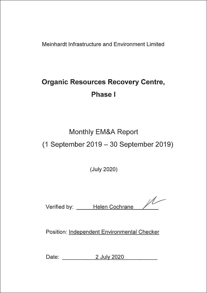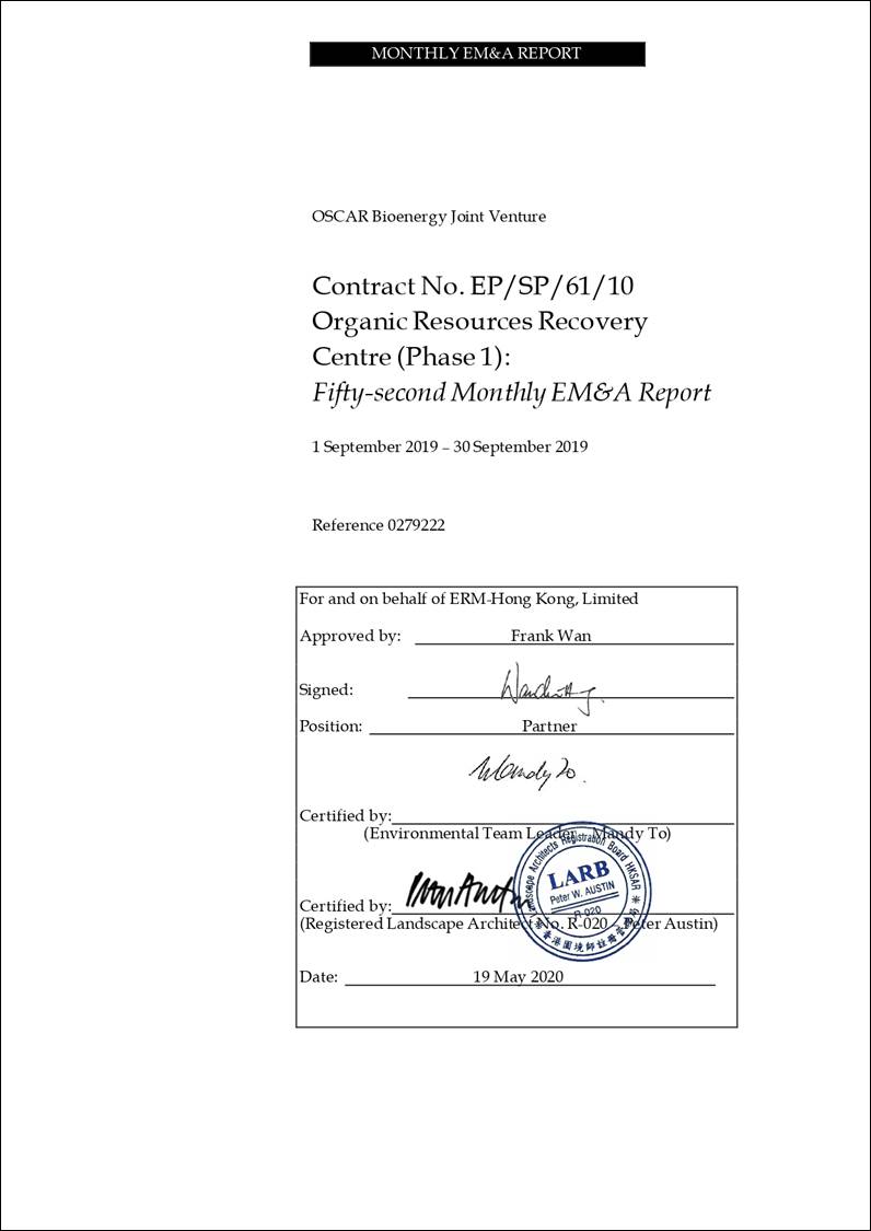 The construction works of No. EP/SP/61/10 Organic Resources Recovery Centre Phase 1 (the Project) commenced on 21 May 2015. This is the 52nd monthly Environmental Monitoring and Audit (EM&A) report presenting the EM&A works carried out during the period from 1 to 30 September 2019 in accordance with the EM&A Manual. Substantial completion of the construction works was confirmed on 3 December 2018. In the meantime, the operation phase EM&A programme had commenced in March 2019.