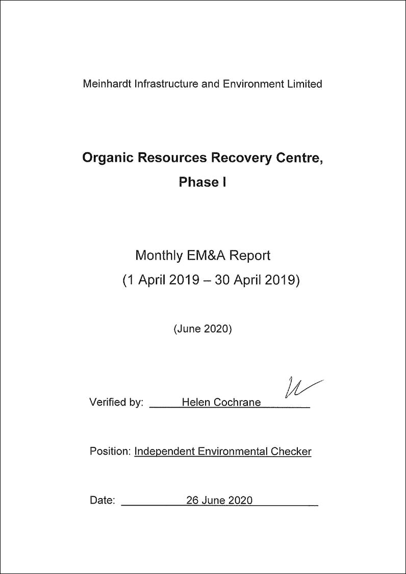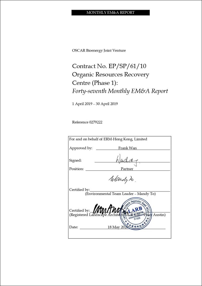 The construction works of No. EP/SP/61/10 Organic Resources Recovery Centre Phase 1 (the Project) commenced on 21 May 2015. This is the 47th monthly Environmental Monitoring and Audit (EM&A) report presenting the EM&A works carried out during the period from 1 to 30 April 2019 in accordance with the EM&A Manual. Substantial completion of the construction works was confirmed on 3 December 2018. In the meantime, the operation phase EM&A programme had commenced in March 2019.