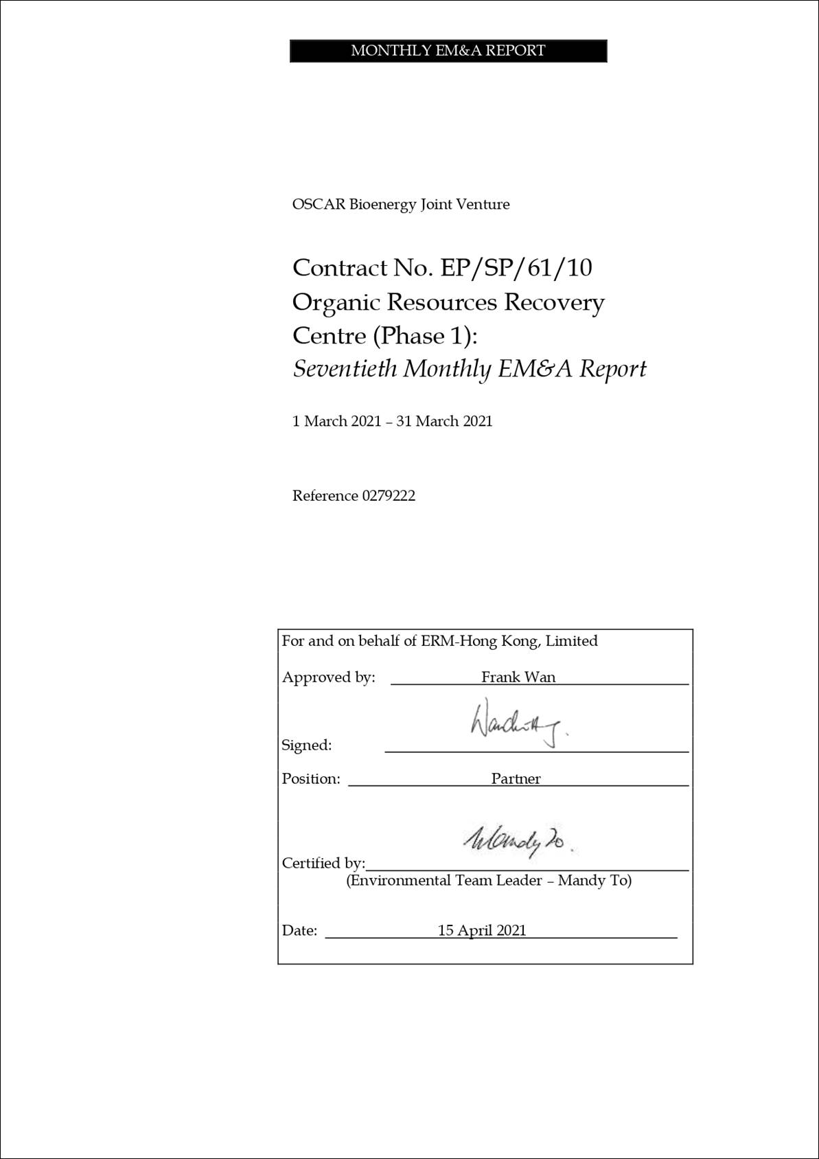 The construction works of No. EP/SP/61/10 Organic Resources Recovery Centre Phase 1 (the Project) commenced on 21 May 2015. This is the 70th monthly Environmental Monitoring and Audit (EM&A) report presenting the EM&A works carried out during the period from 1 to 31 March 2021 in accordance with the EM&A Manual. Substantial completion of the construction works was confirmed on 3 December 2018. In the meantime, the operation phase EM&A programme had commenced in March 2019. Substantial Completion in respect of substantial part of the Works was confirmed on 24 February 2020. The construction phase EM&A programme was completed in the end of February 2020.