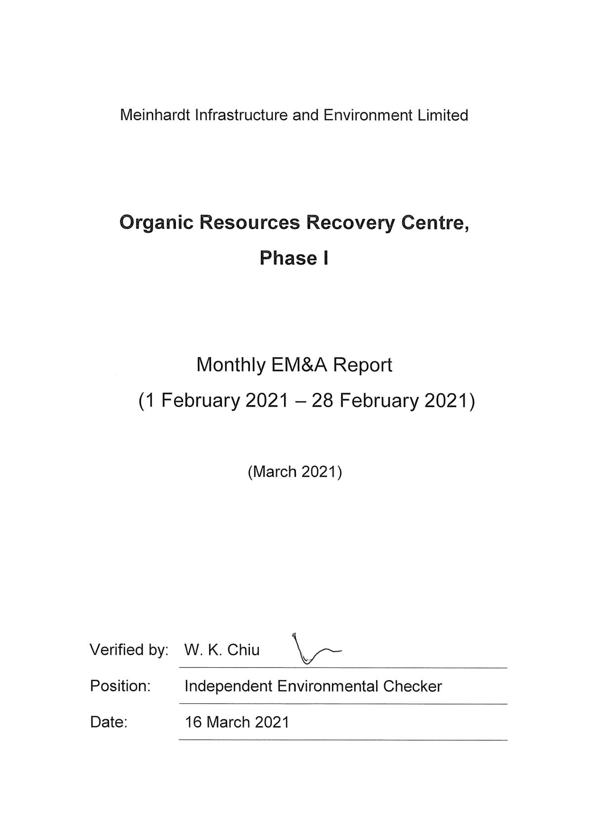 The construction works of No. EP/SP/61/10 Organic Resources Recovery Centre Phase 1 (the Project) commenced on 21 May 2015. This is the 69th monthly Environmental Monitoring and Audit (EM&A) report presenting the EM&A works carried out during the period from 1 to 28 February 2021 in accordance with the EM&A Manual. Substantial completion of the construction works was confirmed on 3 December 2018. In the meantime, the operation phase EM&A programme had commenced in March 2019. Substantial Completion in respect of substantial part of the Works was confirmed on 24 February 2020. The construction phase EM&A programme was completed in the end of February 2020.