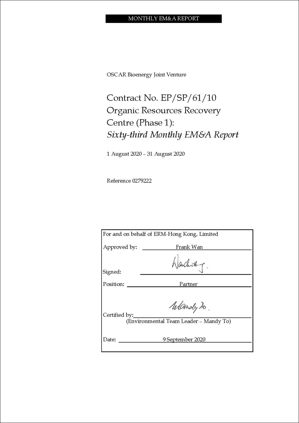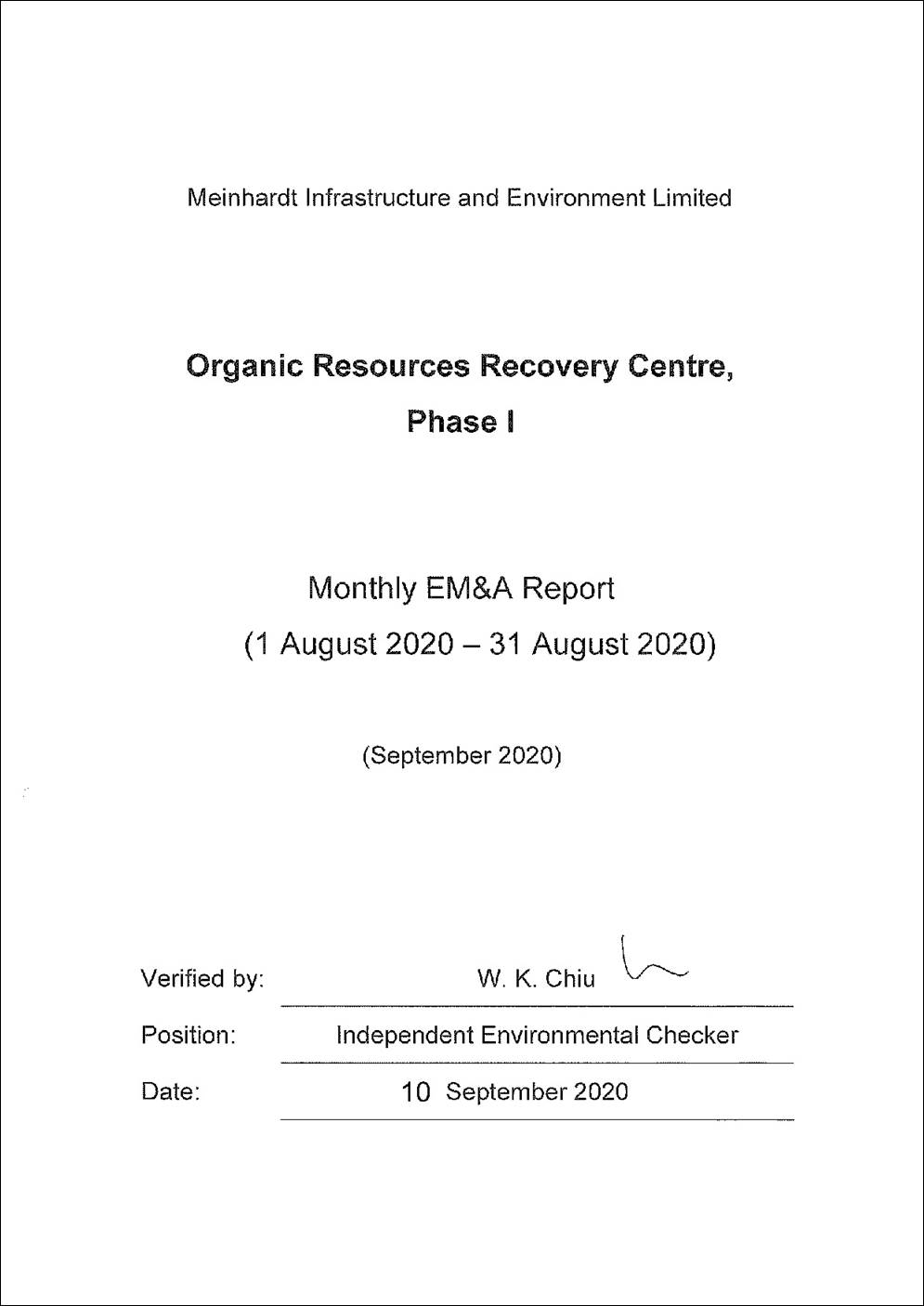 The construction works of No. EP/SP/61/10 Organic Resources Recovery Centre Phase 1 (the Project) commenced on 21 May 2015. This is the 63rd monthly Environmental Monitoring and Audit (EM&A) report presenting the EM&A works carried out during the period from 1 to 31 August 2020 in accordance with the EM&A Manual. Substantial completion of the construction works was confirmed on 3 December 2018. In the meantime, the operation phase EM&A programme had commenced in March 2019. Substantial Completion in respect of substantial part of the Works was confirmed on 24 February 2020. The construction phase EM&A programme was completed in the end of February 2020.